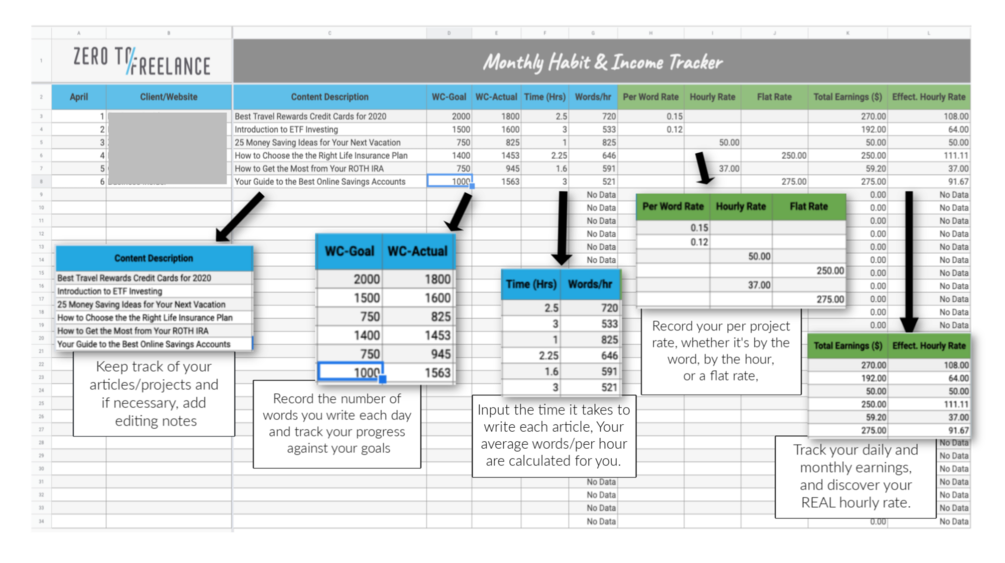 Included: 1 Zero To Freelance Habit & Income Tracker for Freelance Writers
